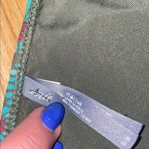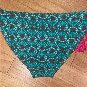 Eye-catching teal bikini with pink floral design. Features a halter top and side-tie bottoms with tassels.