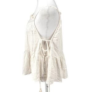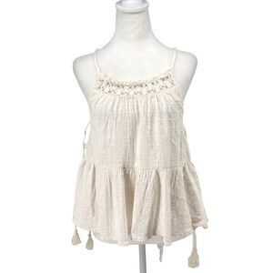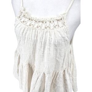 Add a touch of carefree charm to your warm-weather wardrobe with this adorable Aerie white tiered tank top. With delicate crochet lace trim at the neckline, lightweight crinkle-texture fabric, and flirty tassel-tie sides, this top is a summer must-have. The open back adds a breezy, free-spirited vibe that’s perfect for layering over bralettes or swimwear.