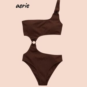 Aerie Wide Rib Cut Out One Shoulder Ring One Piece Brown Swimsuit. Size XL