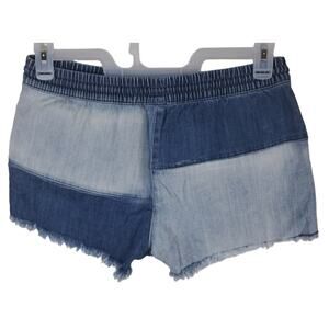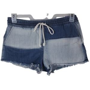 Aerie, Women Medium, Denim Color Block (Light/ Medium/ Dark Patchwork Denim) Drawstring closure, 2 side pockets, Frayed/ Raw hem,