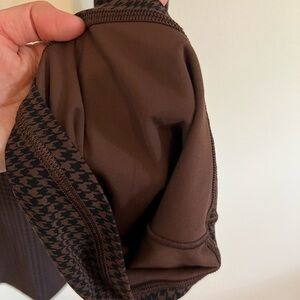 Stylish brown houndstooth leggings. Comfortable and versatile for any occasion.