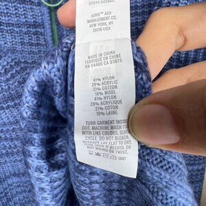 This Aerie knit sweater offers a cozy and stylish appeal. The full-zip front with green trim allows versatile wear. Its blend of materials, including nylon and acrylic, ensures warmth and durability. Ideal for cooler seasons, this sweater combines comfort with a modern design.