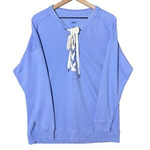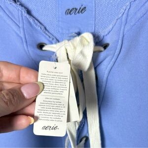Aerie, lace-up sweatshirt, oversized fit, distressed trim, blue pullover, casual style, NWT, women’s size Small, comfy top, loungewear