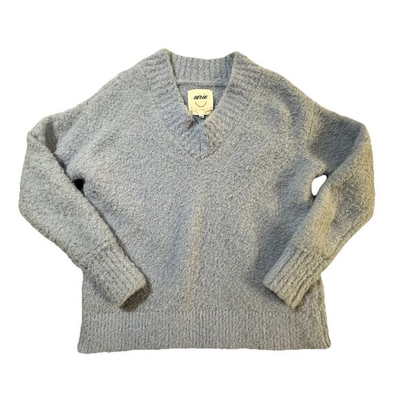 Aerie Women’s V-Neck Sweater Small Blue Fuzzy Soft Long Sleeve Pullover Cozy