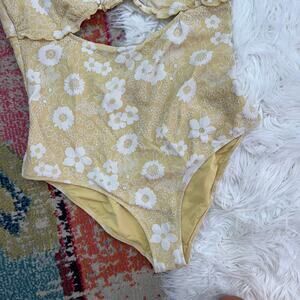 Get ready to make a splash with this cute Aerie one piece swimsuit. The cheerful yellow and white backdrop is adorned with a feminine floral pattern, perfect for adding a touch of sunshine to your swimwear collection. Featuring a halter neckline and a stylish cut-out design, this swimsuit offers both a flattering fit and full coverage. Size XL.