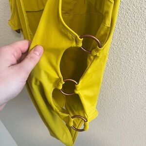 Bright yellow Aerie one-piece swimsuit. Features a deep V-neck and thin straps. Perfect for a sunny day at the beach.