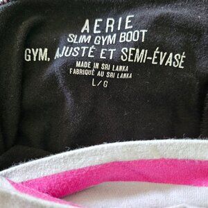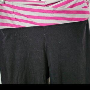 Black yoga pants with a pink and white band that crosses over in the front and scrunched in the back. Boot cut.