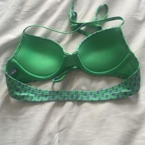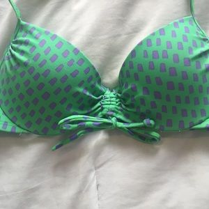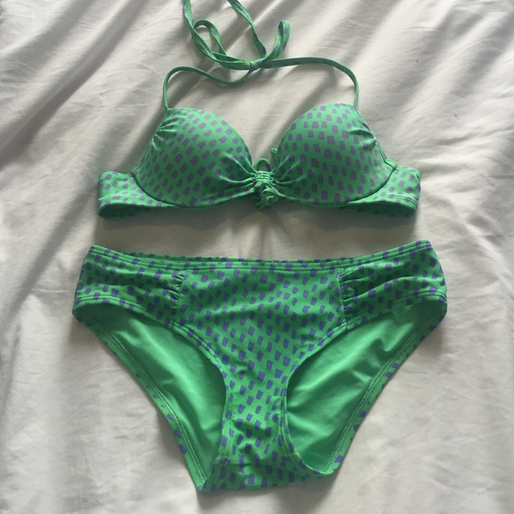 A beautiful green bikini with a purple square print. The bottoms are pretty basic with a thick hip strap and the top has a cute bow feature in the front and then clasps closed in the back. Gently loved but in great condition.