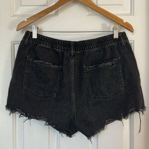 Stylish black distressed denim shorts perfect for casual outings. Comfortable and trendy, these shorts are a must-have for your wardrobe.