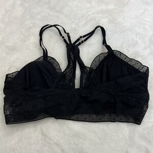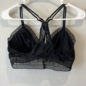 Aerie wireless bralette size L. Beautiful lace with floral and polka dots. Racer back pull in with 4 adjustable straps. Cups are padded. Has ruffle detail along the top.