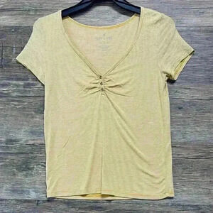 This aerie t-shirt features a sunny yellow color with a flattering V-neckline and ruched detail for a stylish twist.