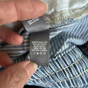 Cesar airy blue and white striped shorts. They have an elastic waist with a drawstring. There are two pockets in the front. They can be machine washed cold would like colors and are 100% cotton.