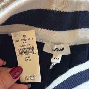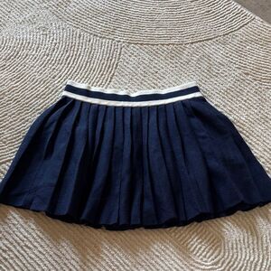 Chic dark blue mini skirt with pleats. Features a striped waistband for style.