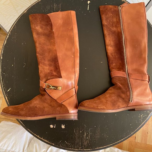 Leather and suede knee length boots with gold buckle details.