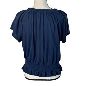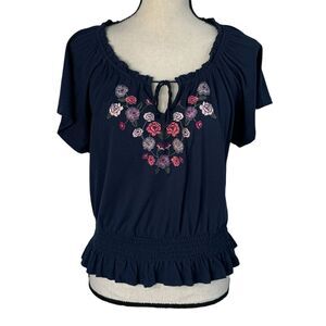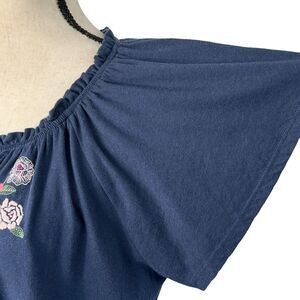 Aero Large Seriously Soft Top Keyhole Neck Flutter Sleeve Floral Embroidery Blue