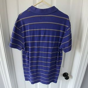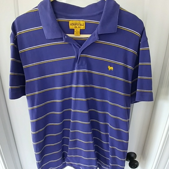 Purple with yellow and white stripes with the Aero bulldog embroidered on the left chest. 100% cotton.