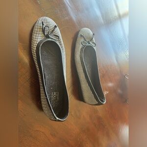 Classic black & white houndstooth flats from Aerology (Aerosoles). Ballet-style with bow detail, comfortable and versatile for everyday wear. Light wear consistent with normal use — see photos.