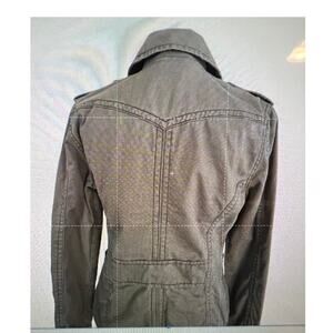 Aeropostal button down jacket, light brown color. Made of cotton. Features two chest pockets, two hand pockets with buttons flaps. Tabs across top of shoulders.
