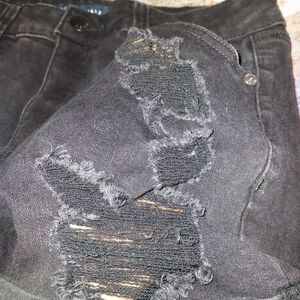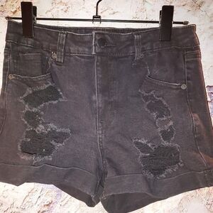 These black jean shorts from Aeropostale showcase a bold distressed design with prominent rips on the thighs, adding an edgy flair to your outfit. Crafted from stretchy denim, they offer a snug and comfortable fit, ideal for casual occasions. The short hemline enhances their trendy appeal, making them a standout piece in any wardrobe.