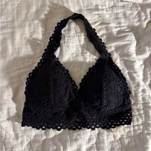 Elegant black lace halter bralette perfect for comfort and style. Features intricate lace detailing for a chic look.