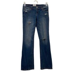 Description: Aeropostale Chelsea Bootcut Jeans Sz 1/2 Button Flap Back Pockets Distressed Denim Flare Logo on Back Embordered Back Pockets Medium Rise Medium Wash