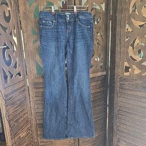 Stylish boot cut jeans. Dark blue hue. Comfortable fit. Perfect for casual wear.
