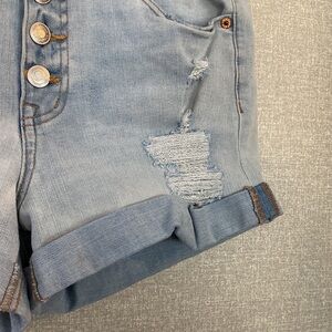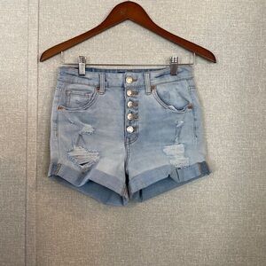 Aeropostale Denim High Rise Midi Button Fly Jean Shorts Size 6 Cute distressed fold up hem cut-off shorts. Light wash Flat lay measured waist 13" Rise 10.5" Inseam 3"