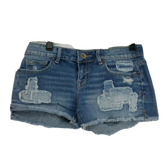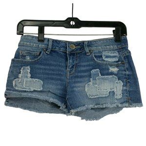 Aeropostale Womens Size 1/2 Juniors Denim Jean Shorts Distressed Ripped Raw Hem Patchwork. Condition is Pre-owned with no stains. Comes from a smoke free and pet free home.