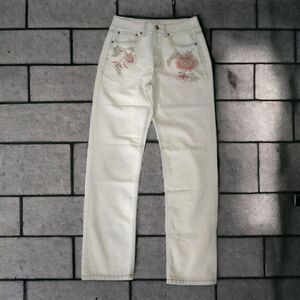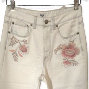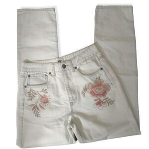 Condition is pre-owned. High waisted mom style, straighter leg. Minimal stretch. Floral embroidery. VERY light wash...looks like an ivory color. PLEASE SEE ALL MEASUREMENTS! No rips, tears, holes or discolorations. Minimal wash wear only, which adds to the character of them.