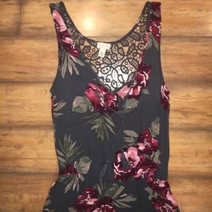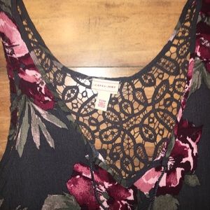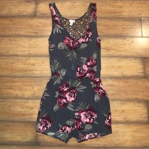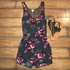 Adorable floral romper with beautiful lace detail on back! Also has a tie front as shown in pictures. Comfy and light, perfect for summer! Also would be cute with a nice cardigan over it. Size XS, but may fit a small as well! Thanks for looking! Offers, bundles and any questions are welcome :)