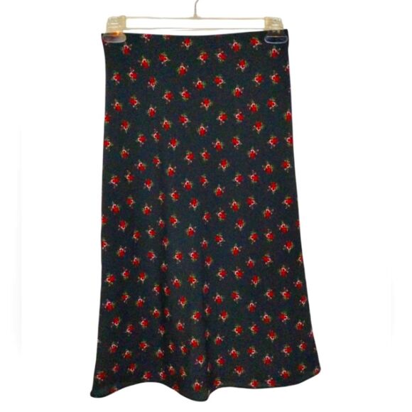 Aeropostale Floral Skirt Midi Elastic Waistband Pull on Black Red Pink and Green Flower All over Print