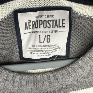 Stylish crewneck sweater with bold gray and white stripes. Features Aeropostale logo detail.