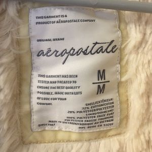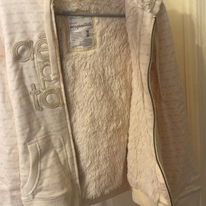 This jacket is the most comfortable thing I have ever worn. In perfect condition, never worn. Tags still attached. Light cream color. Thick for cold weather. Faux fur lined in chest and hood. Insanely soft. Very very light pattern of gray/purple "aero" and hearts on the outer shell. Zip up hoodie. Well made. Says it's a size M but I'd say it would fit a small/medium. Size 3 or 4? Feel free to Ask questions! :)