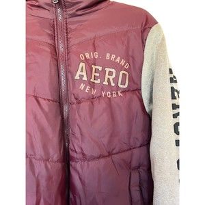 Aeropostale Hooded Jacket-Vintage Style Styled as Varsity, Bomber Jacket It is Quilted slightly puffy. Size Large Beige sleeves have the Aeropostale printed down the left sleeve New With Out Tage Maroon body with Beige Hood and Sleeves Pit to Pit 21.5" Sleeve length 27" Shoulder to hem 28"