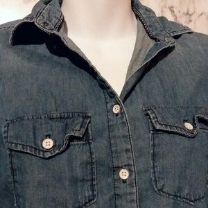 I love the pop of the white buttons on this jean shirt. It helps to dress it up a bit for a dressy casual look. Very good pre-owned condition. No missing buttons.