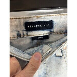 The product is a pair of Aeropostale men's jeans in size 32x32, featuring a super skinny fit in a distressed blue denim with a light wash. These jeans have a mid-rise and a 5-pocket design, with the fabric made of a comfortable cotton blend. The style is modern with a classic American outdoor theme, and they are machine washable for easy care. Perfect for all seasons, these jeans are accented with a logo and offer a breathable and stylish option for everyday wear.