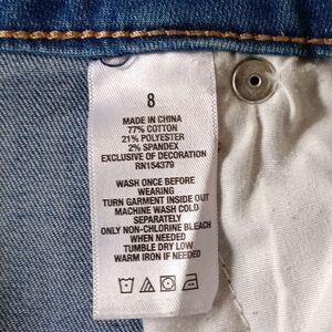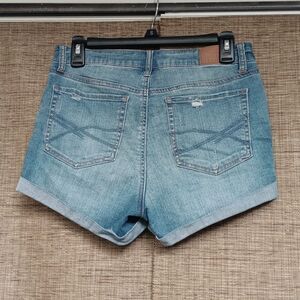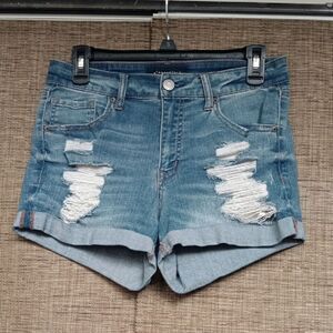 Trendy distressed jean shorts. Light blue with stylish rips. Perfect for casual wear.15 side to side at waist, 10 rise , 3 inseam
