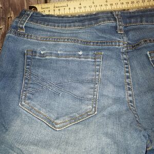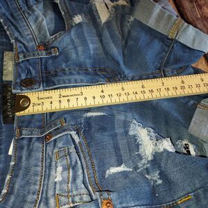 Stylish light blue jean shorts with a distressed look. Rolled cuffs add a casual touch. Ideal for warm weather.