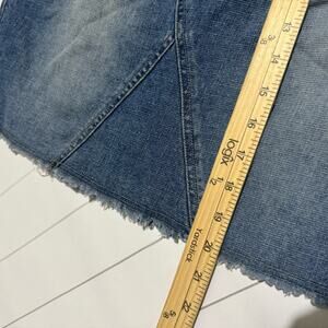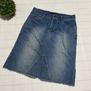 This skirt is in great condition! Light wash stretch denim jean. Raw hem. Long modest knee length with slit in back. Perfect for spring and summer. Sized as a women’s size 1/2 but measures like a small. 4.5.24 V