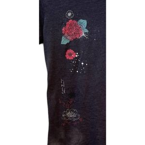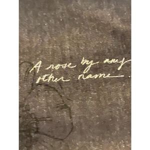 A super comfortable and stylish tshirt by Aeropostale with a rose design that is striking against a black background with the poetic words, A Rose By Any Other Name, printed on the front among the flowers.