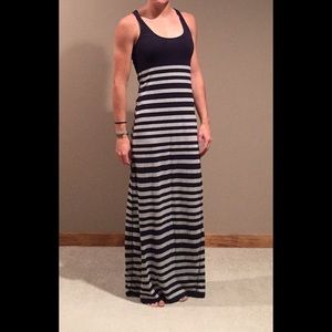 Gray and navy striped maxi dress. Super soft and comfy. Stretchy material. Adorable with a white jean jacket and sandals.