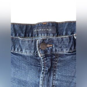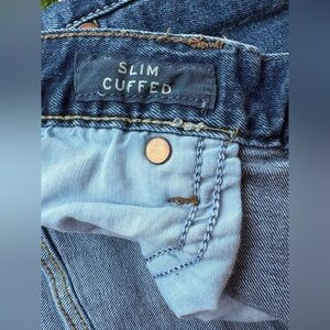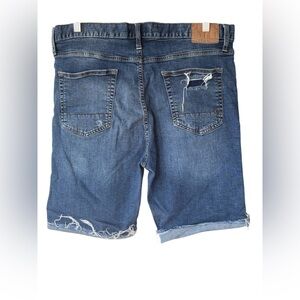 Trendy distressed jean shorts. Perfect for casual wear. Classic blue denim.