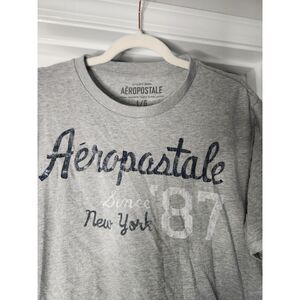 Classic short-sleeve T-shirt by Aeropostale featuring the vintage “Aéropostale Since ’87 New York” logo graphic across the chest. Gray with navy and white distressed print. Comfortable cotton-blend fabric, great for everyday casual wear.
