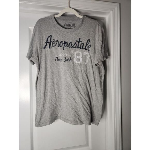 Classic short-sleeve T-shirt by Aeropostale featuring the vintage “Aéropostale Since ’87 New York” logo graphic across the chest. Gray with navy and white distressed print. Comfortable cotton-blend fabric, great for everyday casual wear.
