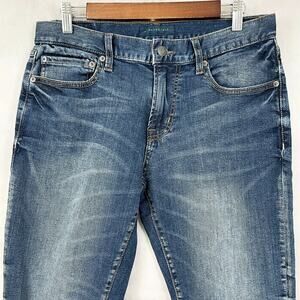 -Features: stretch, distressing, sits at waist, slim through thigh, slightly tapered leg, factory fading and whiskering, knee rips, five pocket style