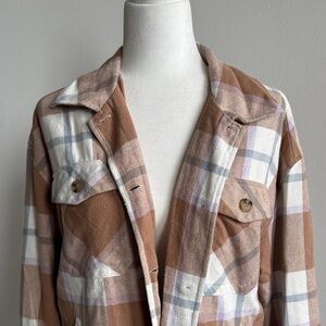 Chic plaid shirt with button-up front. Features a blend of soft colors.