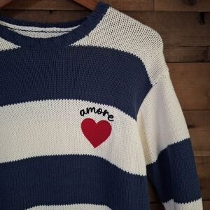 Keywords: oversized sweater, amore heart top, striped knit, coastal grandma style, nautical pullover, cottagecore cozy, Aero knitwear, slouchy sweater, Valentine's top, relaxed fit
