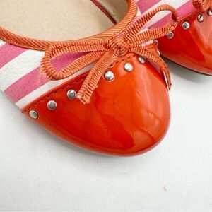 New without tags, these cute pink and white striped fabric ballet flats have an organize pant studded toe cap, orange trim, orange bow and a nice grippy rubber sole. Add fun and whimsy to any outfit.