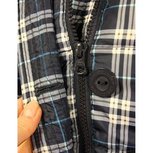 Sporty vest from Aeropostale in a dark blue and white plaid with aqua accent striping.