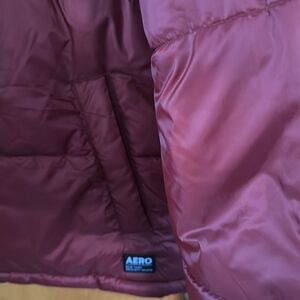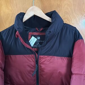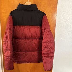 This is new with tags. 100 % polyester. Closes with full zip. The Chest is 52 inches, 26 flat. The length is 28 inches. The sleeves are 27 inches. Drawcord adjust waist. The color is dark red and black. The pockets are fleece lined.